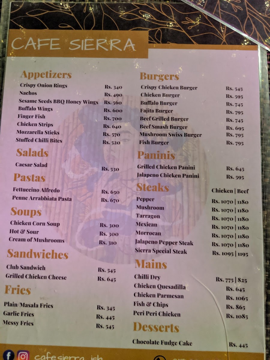 Welcome to Cafe Sierra, a delightful destination perched on the rooftop of the Super Market in F-6 Markaz, Islamabad. This charming café offers an enticing menu designed to please every palate, featuring crispy Fries in various styles like Garlic and Masala, all rich in flavor. Health-conscious diners can enjoy their refreshing Caesar Salad, while those in need of comfort will love the warming Hot & Sour Soup or Chicken Corn Soup.